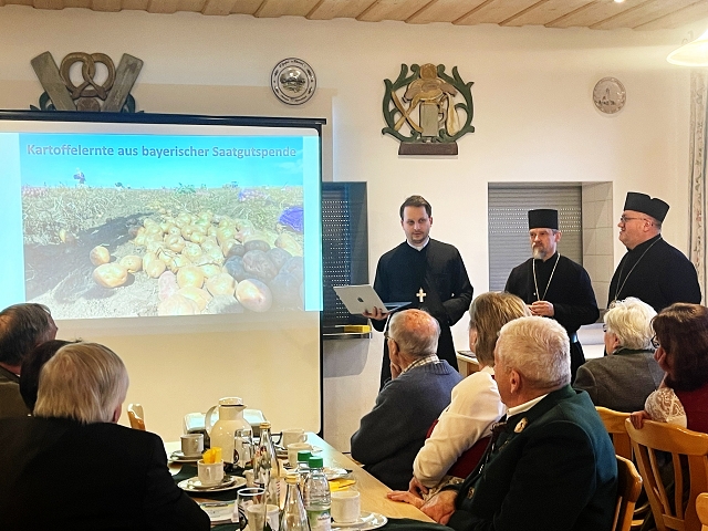 Eine gute Nachricht hatte Erzbischof Martinyuk zum Thema Kartoffeln, dazu sagte er: „Eure Saatkartoffeln sind schön aufgegangen, wir hatten eine gute Ernte und damit für die kommende Winterzeit haben wir einen wichtigen Vorrat“. Nach den Bildern, die auch schwere russische Angriffsschäden durch Raketen und Drohnen ganz in der Nähe von Ternopil zeigten, sagte Kathi Schmid: „Was dort in der Ukraine von der Kirche geleistet wird, das ist für uns unglaublich und unvorstellbar, deswegen wollen wir unsere Hilfe weiter fortsetzen“. Musikalisch gestaltet wurde der Empfang für die Geistlichkeit aus der Ukraine bei Kaffee und Kuchen im Höhenmooser Haus der Vereine durch Riederinger Sängerinnen sowie von Cordula Hausstetter an der Harfe.